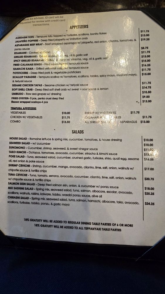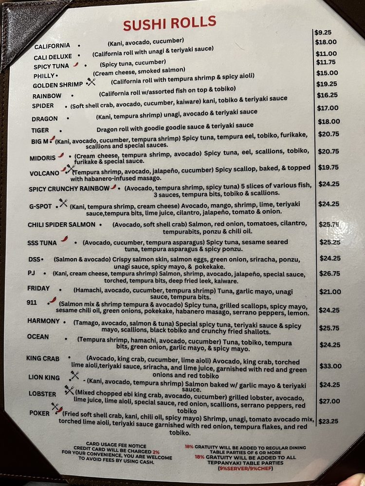 Avocado, unagi, and steamed asparagus. Spicy tuna, tempura scallops, tomato, jalapeño, tobiko, teriyaki sauce, spicy mayo, & chili oil.